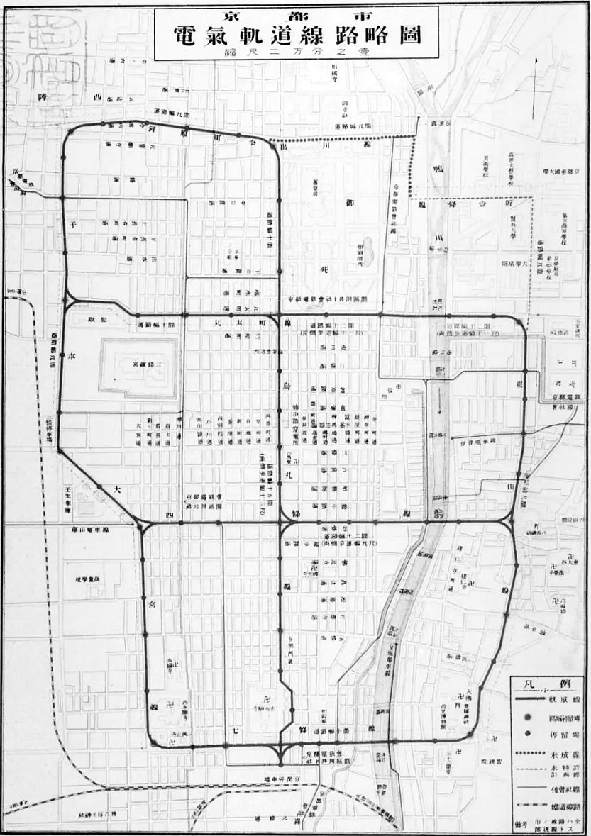 二、次の隔間は廃線とす:七条線(西洞院及東洞院に至る)鴨東線(二条木屋町より東山線に至る)下立売線(堀川より烏丸通に至る)各共用線、新高倉線