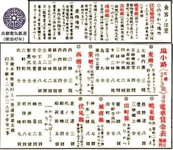 京電開業時は自由乗降方式だったが,効率性や安全面で問題があるため,ほどなく停留場が設定される。左は明治42(1909)年発行の「京都電鉄案内」の抜粋だが,乗降場所の項には,「電車乗降ハ必ず電車停留場(電柱ニ〇〇あり)〇を注意せらるべし」とある。〇の字は読めないが当時架線柱に停留場名が標記されていたことを指すと思われる。東廻線の「上ノ口」停留場は交差通名だが,以前は「六條」と称し,後には「市姫」(旧六条通の市比賣神社から)に変更される等,初期には停留場の位置と名称は小刻みに変更された。通行税導入に伴って,1銭区間は2銭になるが,それを避けて区界停留場2個まで3銭が初乗り運賃となり,以降は区界停留場ごとに1銭ずつ上がり,市内線については8銭が上限とされた。京電開業時には「半区」の定めがあり,半区1銭-1区2銭-1区半3銭-2区4銭という数え方をしたようだ。それによれば税込8銭の上限運賃は3区半に相当する。ただ運賃区間が細かいと切符の売り方も煩雑になるため,明治末年頃までには,区界停留場2個ごとに2銭上がる運用になり,さらには市内線では3区(税込7銭)が上限とされたようだ。市電開業時(1912年6月)には,区間制を採用する京電の営業妨害とならぬよう,1区2銭-2区4銭-3区6銭のいわゆる「2-4-6制」が採用された。これは税別なので,実際は税込3銭-5銭-7銭となり,3区7銭の上限運賃は京電に揃えられた。