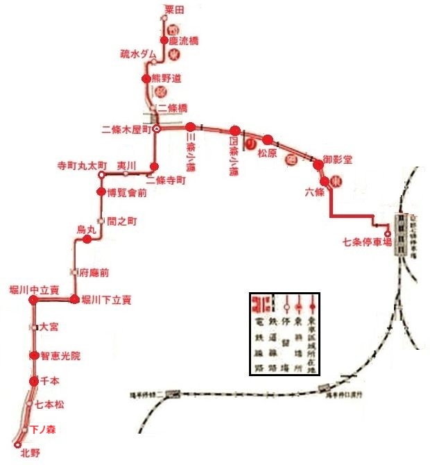 三、左の区間は単線運転とす:寺町線、西洞院線(七条より四条に至る)