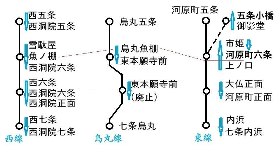 京電の西洞院線の敷設は遅れた為,停留場名が西六条や西松原等,木屋町線を基準として「西」を付すものが多いが,札幌市電の山鼻西線の停留場名(西線6条等)を想起させる。(12/14/2025)