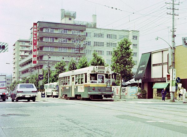 | 太子道を京都駅へ向かう4A系統1863号。太子道は広隆寺の参道を意味するが,実際には殆どの区間で旧二条通と呼ばれる。当所の前後は急行停車停留場が4ヶ所連坦した為,急行通過としても良かった気がする。後ろに見える「玉姫殿」のビルは,3階建の式場に姿を変えて営業中。(1977.7) |