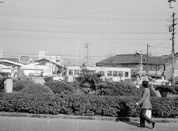 | 二条駅本屋側から,植栽帯越しに千本線を北行する1809号を見る。1乙か21乙系統だが,前者の確率が高い。駅前に直進する御池通には,市電との競合を避ける為に京電・城南線が押小路から移設されたが,市電による買収と同時に休止されたので,僅か6年間の営業だった。(1971.7) |