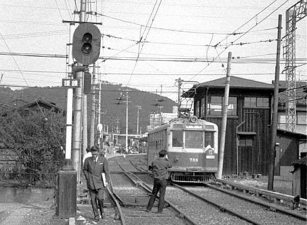 | 廃止が迫る稲荷線・京阪線交差を渡る19系統708号。脱線ポイントと援護信号機が特徴的だが,線路上の撮影者の興味はそこには無いようだ。ここでは何度か衝突事故が発生し,大津線の単車が市電に現物支弁されたこともあった。南西角の信号建屋の存在が歴史を物語る。(1970.3) |